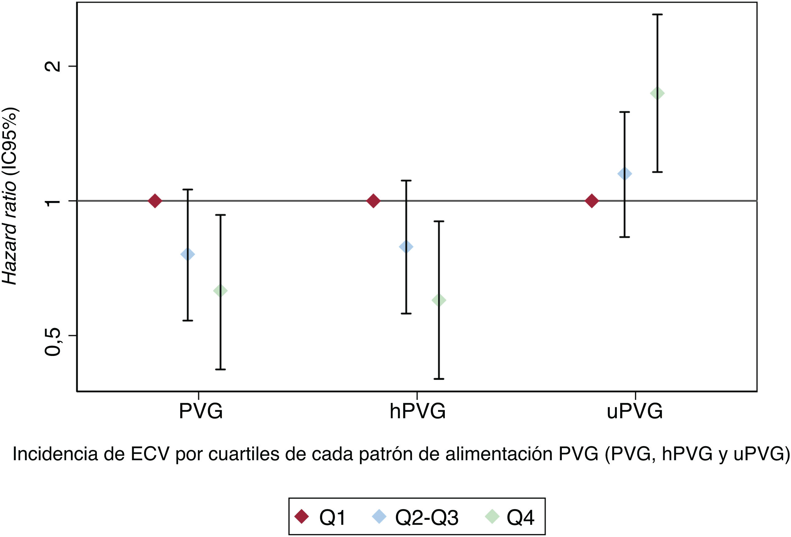 ECV: enfermedad cardiovascular; FFQ: cuestionario de frecuencia de consumo de alimentos; hPVG: provegetariano saludable; HR: hazard ratio; IC95%: intervalo de confianza del 95%; PVG: provegetariano; uPVG: provegetariano no saludable.