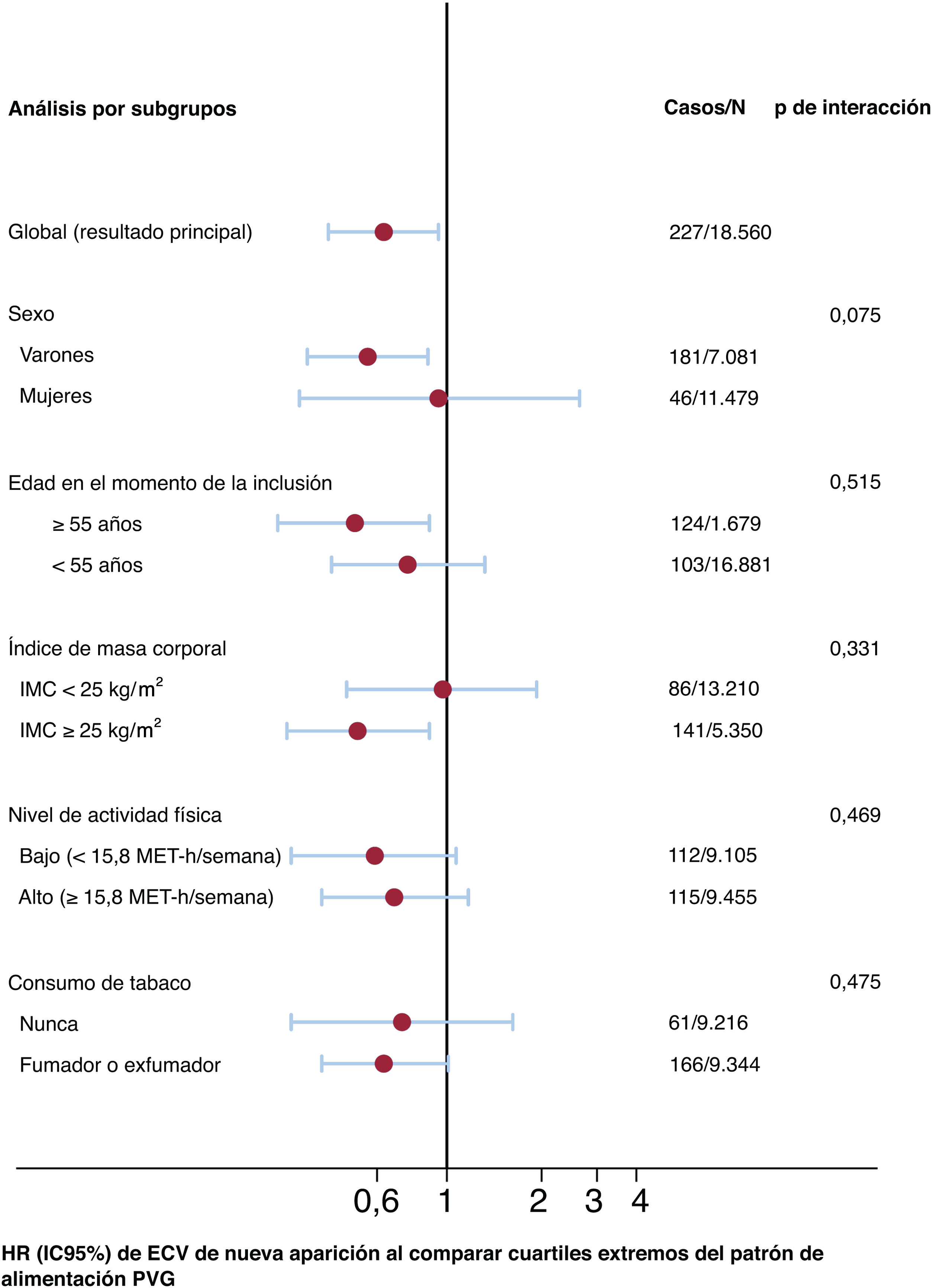 Se estudió el posible efecto de modificación de cada patrón de alimentación PVG por sexo, edad, IMC, actividad física y consumo de tabaco. En este análisis de subgrupos, se evaluó la interacción estadística con pruebas de razón de verosimilitud.