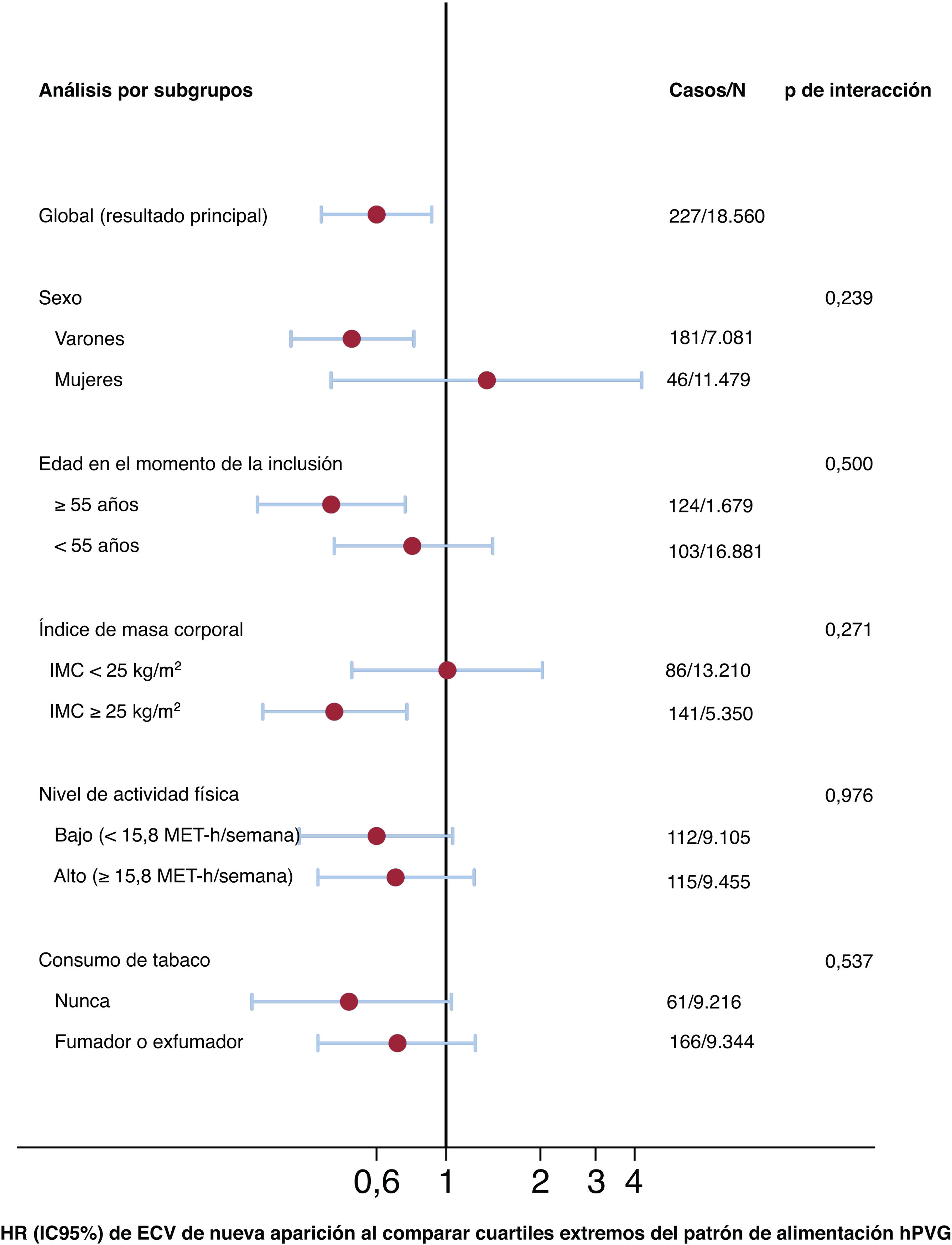 Análisis de subgrupos para la asociación entre el patrón de alimentación provegetariano saludable y la incidencia de enfermedad cardiovascular. Ajustado por edad, sexo, IMC, situación conyugal, años de educación universitaria, actividad física, consumo televisivo, aporte de energía, consumo de tabaco acumulado, consumo de tabaco, consumo de alcohol, dieta especial y picoteo, cáncer, diabetes, hipertensión, hipercolesterolemia, hipertrigliceridemia, fármacos cardiovasculares y antecedentes familiares de ECV. ECV: enfermedad cardiovascular; HR: hazard ratio; IC95%: intervalo de confianza del 95%; IMC: índice de masa corporal; hPVG: provegetariano saludable; MET: equivalentes metabólicos.
