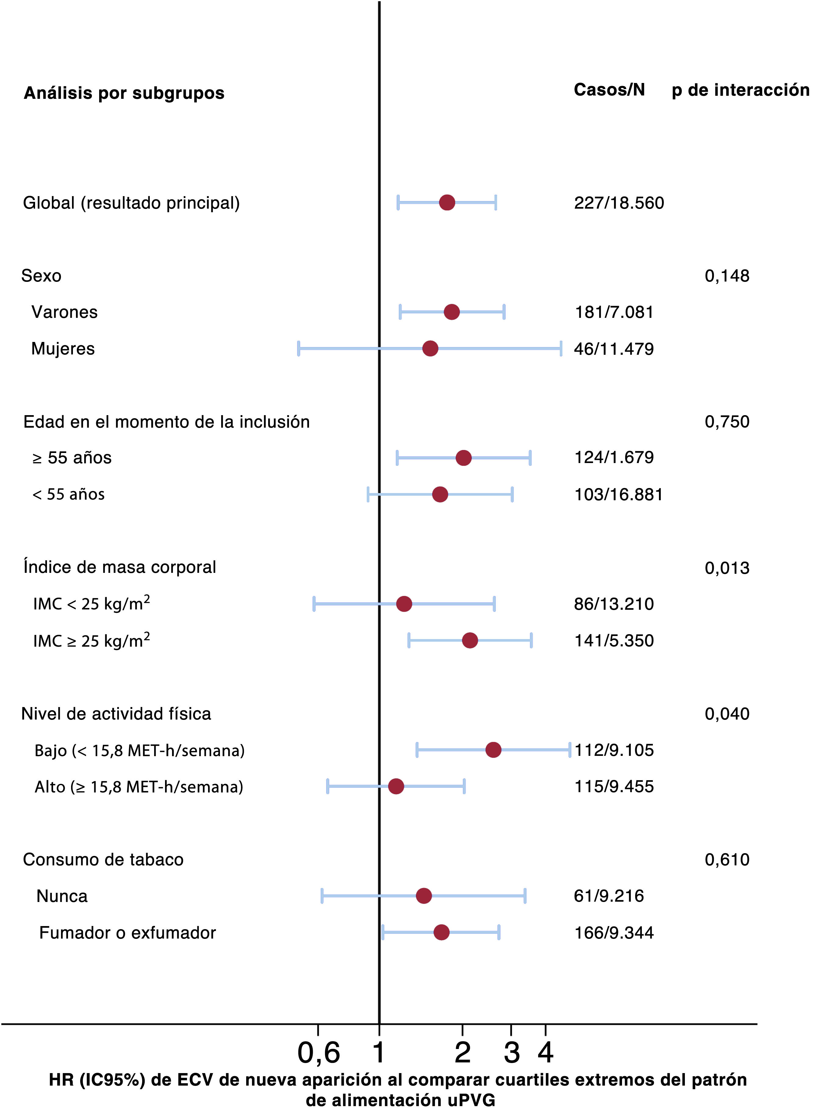 No se observó ninguna interacción estadísticamente significativa entre los patrones de alimentación PVG y el sexo, aunque el efecto fue más aparente entre los varones que entre las mujeres. Se observó interacción entre el patrón de alimentación uPVG y el IMC (p de interacción=0,013). El valor nominal de p también fue significativo para el efecto de modificación por la actividad física (p de interacción=0,040). No obstante, estas interacciones no se mantuvieron estadísticamente significativas tras corregir para múltiples comparaciones con el método de Bonferroni (valores de p corregidos: IMC=0,065; actividad física=0,200) (figura 2, figura 3 y figura 4).