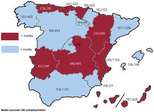 Los datos poblacionales para los distintos cálculos de tasas referidas a millón de habitantes, tanto nacionales como por comunidad autónoma y provincia, se obtuvieron de los datos del Instituto Nacional de Estadística14. Como en años anteriores, se comparan los datos de este registro con los proporcionados por la European Confederation of Medical Suppliers Associations (Eucomed)15. Los porcentajes en cada una de las variables analizadas se calcularon teniendo en cuenta la información disponible sobre la variable de análisis con el número total de implantes. En el supuesto de que concurrieran varias formas de arritmias registradas, se consideró la más grave.