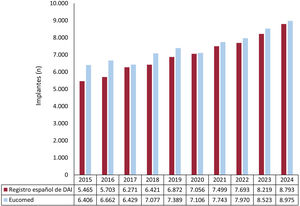 Desde que se inició el Registro español de DAI, se ha producido un incremento progresivo en el número de DAI implantados, con reducciones puntuales en 2011-2012, 2017 y 2020. Como consecuencia de la reducción de la actividad hospitalaria que supuso la pandemia de la COVID-19, en 2020 se observó una disminución del 4% en los implantes de DAI en comparación con los años previos. En el año 2021 se produjo la normalización de la actividad hospitalaria y desde entonces se observa un crecimiento mantenido del número de implantes de DAI en España hasta alcanzar en 2024 el mayor número de implantes desde que se inició el registro.