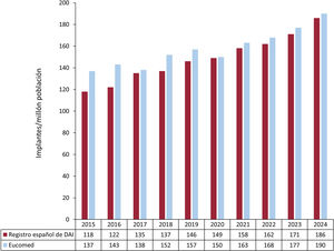 Comparación con otros paísesEspaña presenta la menor tasa de implante de DAI por millón de habitantes en comparación con el resto de los países europeos que participan en Eucomed, con una tasa que en el año 2024 se situó en 317 DAI/millón de habitantes (incluidos DAI y DAI-TRC). Este valor es superior al de años previos (310 en 2023, 300 en 2022, 297 en 2021, 285 en 2020, 303 en 2019, 302 en 2018, 307 en 2017 y 316 en 2016). Los países con un mayor número de implantes fueron la República Checa, Alemania e Italia (474, 471 y 457 dispositivos por millón de habitantes, respectivamente). España sigue siendo el país con menor número de implantes indexados por población (186 implantes/millón de habitantes en 2024), por debajo de los países que le siguen en la franja inferior de implantes de DAI en Europa como Finlandia, Hungría, Reino Unido o Portugal (219, 219, 231 y 280 implantes por millón de habitantes en 2024, respectivamente).