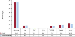 | Implante profiláctico | 21 (45,6) | 20 (48,8) | 27 (62,8) | 58 (69,8) | 24 (39,3) | 7 (36,8) | 22 (40) |