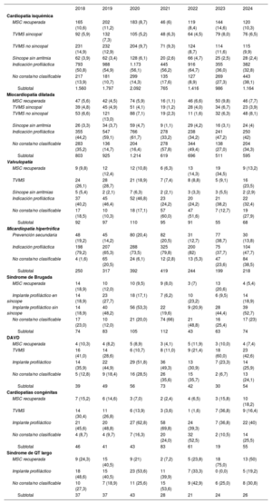 La indicación de DAI más frecuente en 2024 continúa siendo la cardiopatía isquémica, seguida de la miocardiopatía dilatada. Prácticamente, ambas suponen el 75% de todas las indicaciones de DAI que se implantan en España. Al igual que en años previos se observa una menor utilización del tratamiento con DAI en pacientes con miocardiopatía dilatada, fundamentalmente como consecuencia de la reducción del número de implantes en prevención primaria (tabla 2). Diversas publicaciones pueden explicar estas cifras. Además del estudio DANISH23, las guías de la Sociedad Europea de Cardiología para el diagnóstico y tratamiento de la insuficiencia cardiaca presentadas en 20213, así como para el tratamiento de los pacientes con arritmias ventriculares y para la prevención de la MSC2 presentadas en 2022 han disminuido el nivel de recomendación de DAI en prevención primaria de MSC para pacientes con miocardiopatía dilatada no isquémica (IIa-A). Sin embargo, la indicación de DAI en la miocardiopatía dilatada sigue siendo objeto de controversia, así la guía de insuficiencia cardiaca admite un posible efecto beneficioso del DAI para pacientes con miocardiopatía dilatada y edad <70 años, en los que una publicación del mismo estudio ha mostrado una reducción de la mortalidad del 30%3. Además, la guía también refleja los resultados de un metanálisis que incluye el estudio DANISH, en el que el DAI reduciría la mortalidad por todas las causas de los pacientes con miocardiopatía no isquémica24. Por otro lado, la guía para el tratamiento de pacientes con arritmias ventriculares recomienda la implementación del análisis genético para la detección de mutaciones que se asocian a un elevado riesgo de MSC y la detección de realce tardío de gadolinio en la resonancia cardiaca para mejorar la estratificación del riesgo de MSC de los pacientes con miocardiopatía dilatada2. En 2023, la Sociedad Europea de Cardiología publicó una nueva guía de práctica clínica para el tratamiento de las miocardiopatías25. Esta guía define una nueva entidad, la miocardiopatía no dilatada del ventrículo izquierdo, en la que habría una disfunción ventricular o una captación patológica de gadolinio sin dilatación ventricular. La guía considera el implante de DAI (recomendación IIa-C) tanto en la miocardiopatía dilatada como en la no dilatada ante la detección de mutaciones de alto riesgo de MSC, o presencia de captación tardía de gadolinio en la resonancia magnética cardiaca, tanto en los pacientes con FEVI <35% como en los pacientes con FEVI >35%. Finalmente, un análisis de coste-efectividad del DAI para la prevención primaria de la MSC realizado en nuestro medio, reflejó como el DAI se asociaría a una reducción en la mortalidad por cualquier causa tanto en la cardiopatía isquémica (hazard ratio [HR]=0,70; IC95%, 0,58-0,85) como en la no isquémica (HR=0,79; IC95%, 0,66-0,96). En este estudio, la razón de coste-efectividad estimada mediante análisis probabilístico fue de 19.171 euros por año de vida ajustado por calidad (AVAC) en pacientes con cardiopatía isquémica; 31.084 euros/AVAC en pacientes con miocardiopatía dilatada no isquémica, y 23.230 euros/AVAC en los menores de 68 años26. Estos resultados confirman la eficiencia del DAI para la prevención primaria de la MSC en pacientes con disfunción del ventrículo izquierdo de origen isquémico o no isquémico, especialmente en los menores de 68 años.