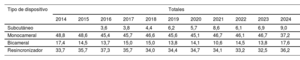 Distribución (porcentaje) de los tipos de dispositivo implantados