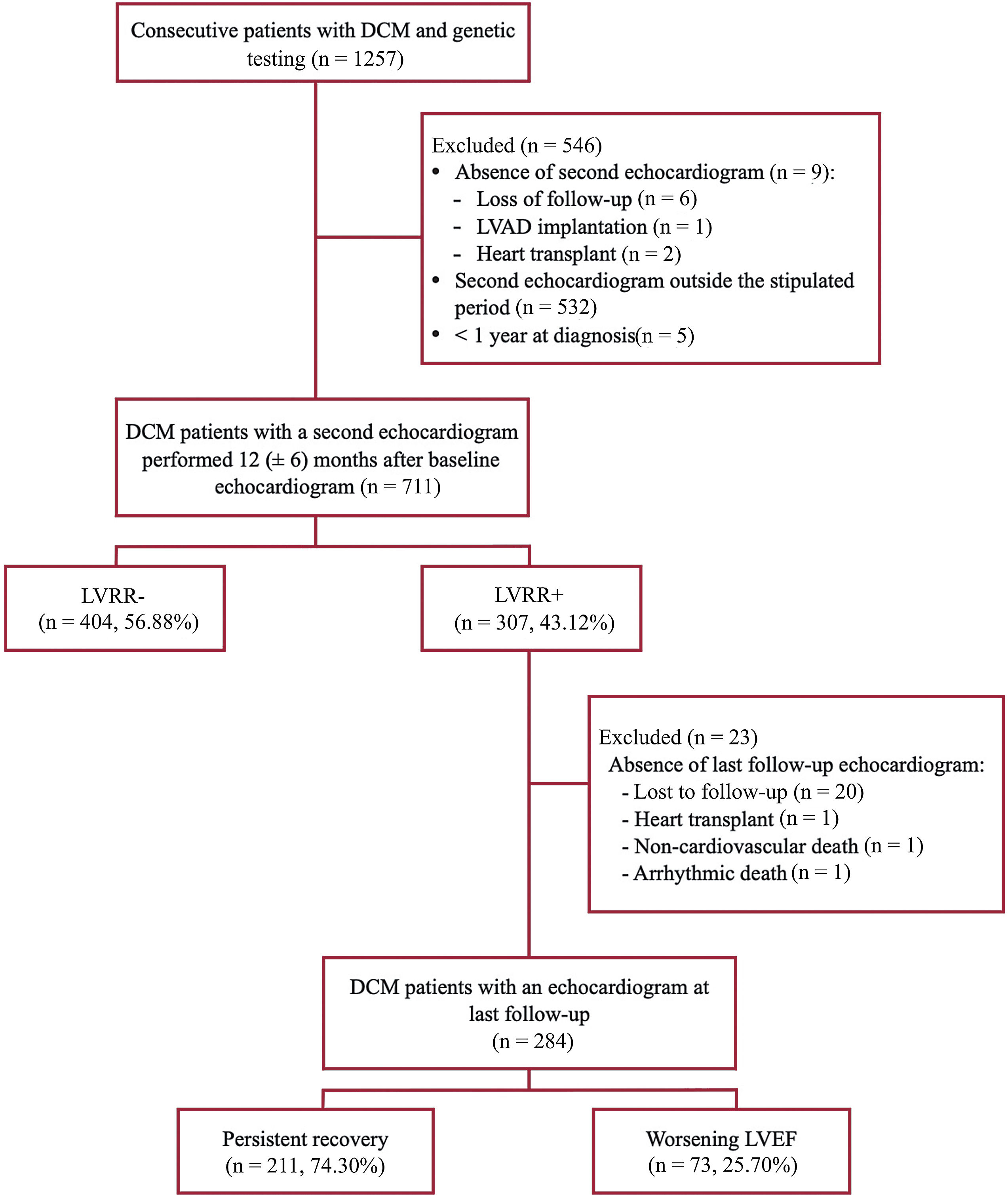 LimitationsThe limitations of the study include its observational nature and retrospective design. Neurohormonal therapy was initiated and up-titrated according to routine clinical practice. Given the inclusion period of the study, most patients were not receiving SGLT2 inhibitors. Differences in baseline clinical profiles among genotypes may have led to differences in treatment intensity, potentially influencing LVRR outcomes. Main DCM genes were evaluated in all cases, but the genes included in NGS target panels varied between centers and over time, reflecting the evolving knowledge of DCM genetics in recent years. Although this is the largest cohort of genotyped DCM patients with serial echocardiographic evaluations reported to date, the limited number of patients belonging to certain gene groups restricts our ability to reach conclusions about these patients, especially regarding long-term follow-up, where the number of patients is limited. Furthermore, for the purpose of this study, at least two echocardiograms were required throughout follow-up. Therefore, patients who died or required a transplant before the second echocardiogram did not qualify for the study, which may introduce survivor bias. Finally, participating centers were specialized inherited cardiac diseases and heart failure units; therefore, findings might not be extrapolated to other settings.