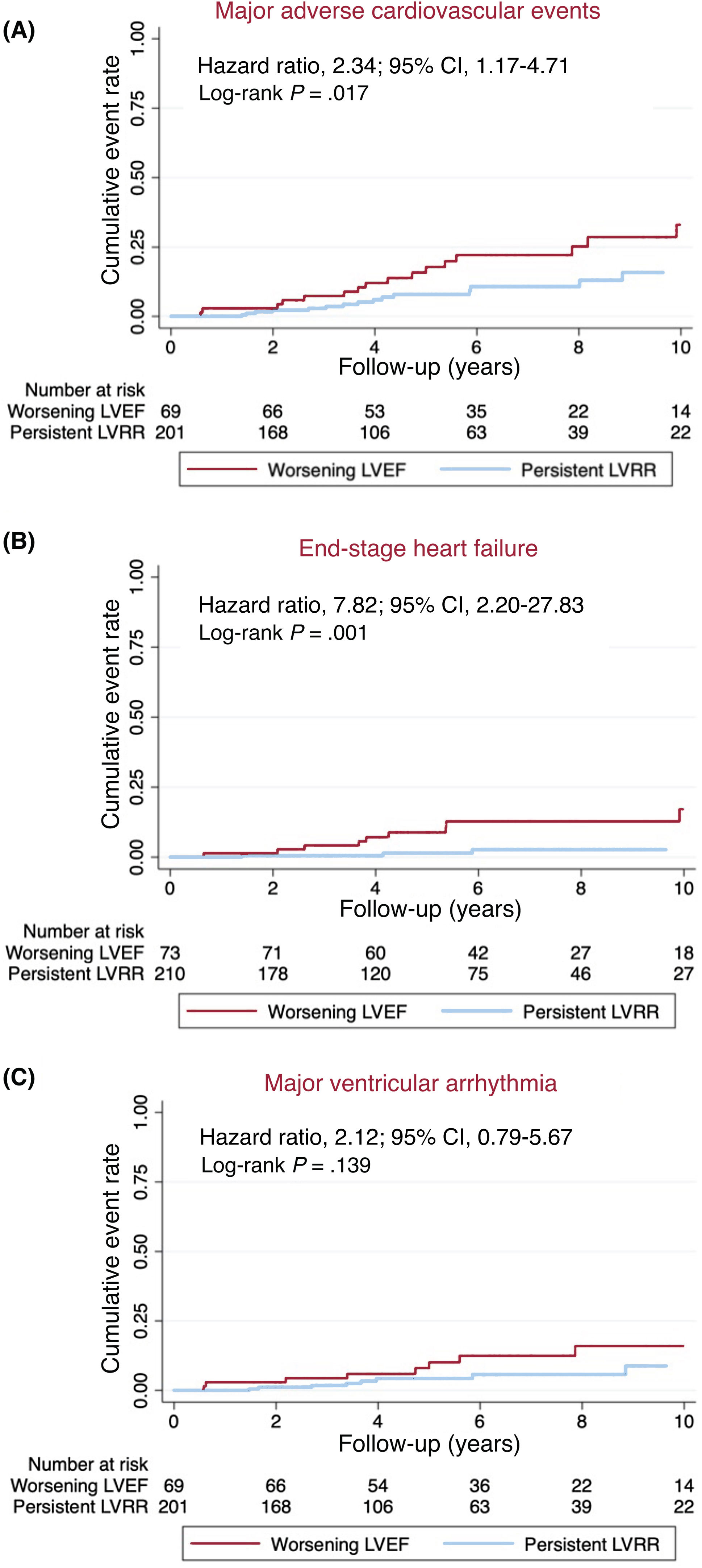 Outcomes in patients with persistent LVRR vs those with worsening LVEF among patients with an initial positive LVRR. Cumulative event rates for (A) major adverse cardiovascular events, (B) end-stage heart failure, and (C) major ventricular arrhythmia at last follow-up. 95%CI, 95% confidence interval; LVEF, left ventricular ejection fraction; LVRR, left ventricular reverse remodeling.