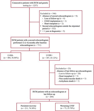 RESULTSA total of 711 DCM patients from the 1257 individuals with DCM included in the Spanish genetic DCM study had an echocardiogram performed 12±6 months after initial evaluation and met the inclusion criteria (figure 1). Of them, 618 (86.9%) were unrelated index cases and 93 (13.1%) were relatives.