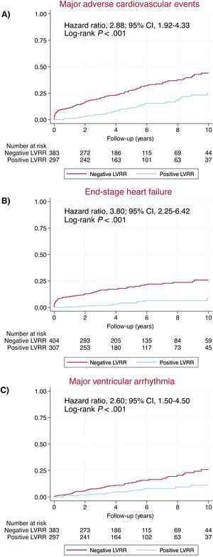 Outcomes according to LVRR at mid-term are presented in figure 3 and . MACE occurred in 121 (30.0%) patients among those without LVRR and in 35 (11.4%) patients among those with LVRR. The hazard ratio (HR) for MACE in patients without LVRR was 2.88 (95%CI, 1.92-4.33; P <.001) compared with LVRR peers. ESHF occurred in 80 (19.8%) patients in the group without LVRR and in 17 (5.5%) in the group with LVRR (HR, 3.80; 95%CI, 2.25-6.42; P <.001). MVA occurred in 60 (14.9%) in the group without LVRR and in 19 (6.2%) in the group with LVRR (HR, 2.60; 95%CI, 1.50-4.50; P <.001).