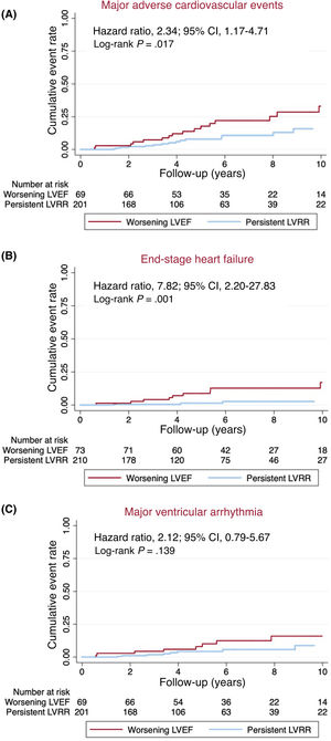 Outcomes and events according to LVRR persistence at long-term are presented in . After a median follow-up of 4.54 years [IQR 2.80-7.53 years], 33 patients had MACE (11.6%), 16 (5.6%) had ESHF events, and 18 (6.3%) MVA. MACE occurred in 18 (24.7%) patients in the worsening LVEF group and in 15 (7.1%) patients in the persistent LVRR group. The HR for MACE was 2.34 (95%CI, 1.17-4.71; P=.017) for patients with LVEF worsening compared with the persistent-LVRR group. ESHF occurred in 13 (17.8%) patients in the worsening LVEF group and 3 (1.4%) patients in the persistent LVRR group (HR, 7.82; 95%CI, 2.20-27.83; P <.001). MVA occurred in 9 (12.3%) patients in the worsening LVEF group and 9 (4.3%) patients in the persistent LVRR group (HR, 2.12; 95%CI, 0.79-5.67; P=.139) (figure 4, ).
