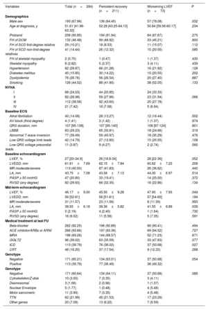 | Variables | Total (n=284) | Persistent recovery (n=211) | Worsening LVEF (n=73) | P |