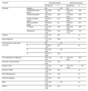 Logistic regression analysis was applied to determine the association of genotype and clinical variables with LVRR. The multivariate analysis was performed using the forward stepwise logistic regression method and a significance level of 0.05. Only patients with complete data for all covariates included in the final model were analyzed (complete-case analysis; n=636). Clinical, echocardiographic, and genetic parameters that were statistically significant in the univariate analysis were included (P <.05). The presence of negative T waves was not included due to collinearity. Treatment with SGLT2 inhibitors was not included since quadruple therapy was not well established in the inclusion period of our study, and information was not available on all patients.