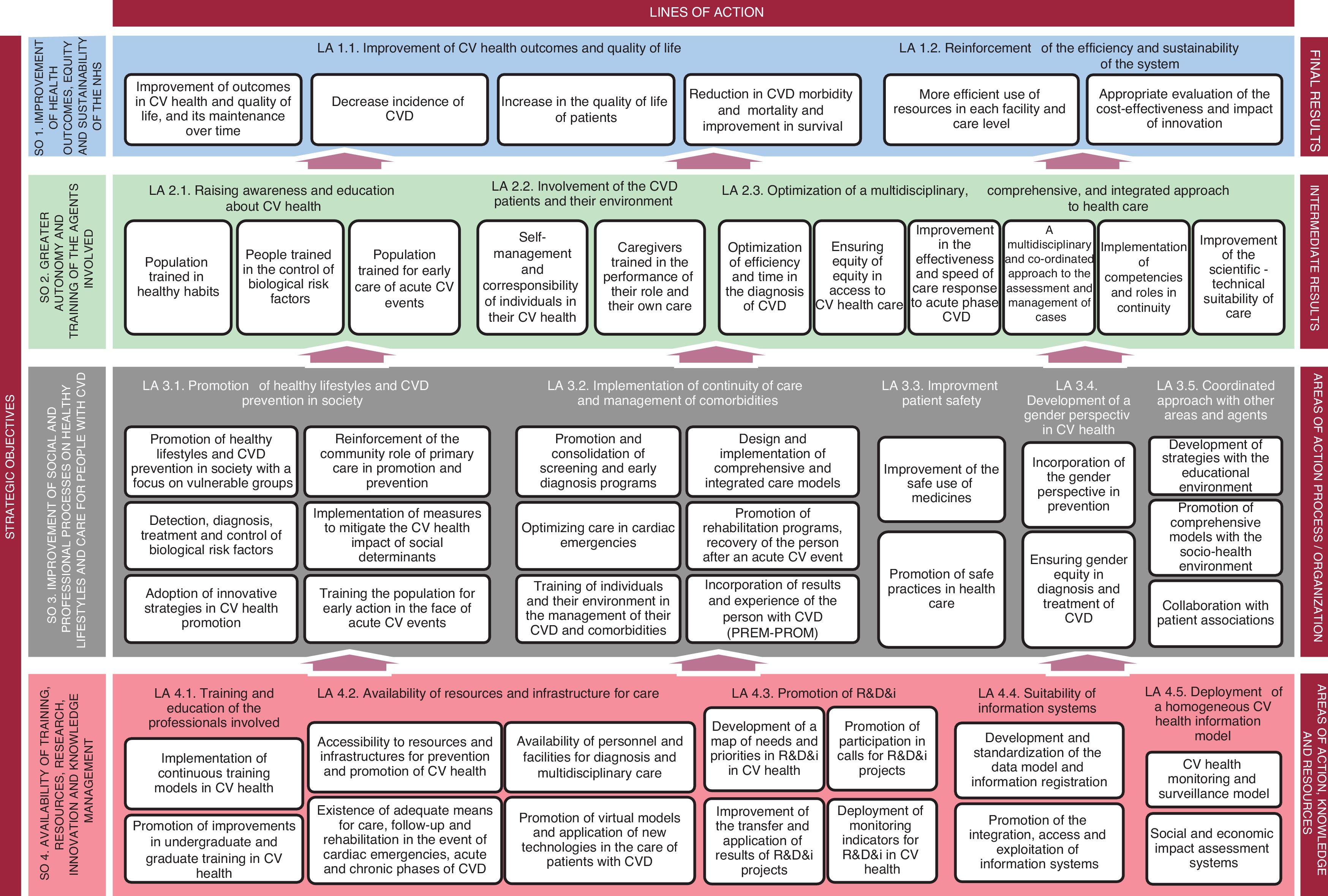 ResultsThe strategy was structured around a matrix with 6 cross-cutting themes (citizen empowerment; health promotion, prevention, and early CVD detection; comprehensive management of acute and chronic CVD; health care coordination; equity; and knowledge management) and 4 longitudinal lines (ischemic heart disease, heart failure, arrhythmias, and valve disease). The framework was further supported by 3 overarching axes: continuity of care, patient safety, and leveraging of information systems. A total of 27 critical points were selected, leading to the definition of 99 strategic objectives (32 general and 67 specific) and 136 actions through iterative reviews and prioritization. Strategic maps were developed for the overall strategy and for each action line, incorporating 61 indicators to facilitate and monitor the development of the strategy.
