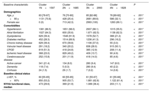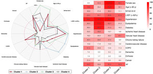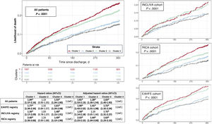 ResultsWe identified 4 distinct clusters. One-year mortality was 18.7%. Cluster 4 (younger women with a valvular heart disease phenotype) had the lowest mortality (13.7%; reference category), which increased progressively in cluster 2 (cardiometabolic phenotype; mortality: 15.7%; adjusted HR, 1.28; 95%CI, 1.06-1.54), cluster 3 (very elderly female phenotype; mortality: 20.4%; adjusted HR, 1.63; 95%CI, 1.40-1.90), and cluster 1 (male phenotype with cardiomyopathy; mortality: 24.0%; adjusted HR, 1.81; 95%CI, 1.53-2.13). The results were very similar when each registry was analyzed individually. Treatment with renin-angiotensin system inhibitors was associated with better survival in all clusters, beta-blockers were beneficial in cluster 1, and anticoagulants in cluster 4. However, none of the treatments show