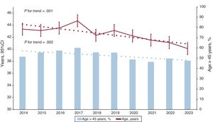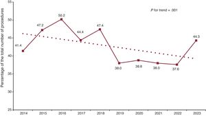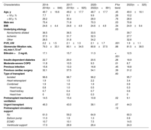 Continuous quantitative variables are presented as mean±standard deviation, while categorical variables are expressed as percentages. The nonparametric Kendall tau test and the Wilcoxon test for trends were used to assess temporal trends in the categorical and quantitative variables, respectively.2 Cumulative survival was estimated using the Kaplan-Meier method and differences between groups were determined using the log-rank test. Differences were considered statistically significant at a 2-tailed P<.05.