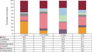 The specific causes of death in the first 5 posttransplant years remained infection (25.8%) and primary graft failure (19.5%) (figure 6). As expected, primary graft failure was the leading cause of death in the first posttransplant month (37.8% of all deaths). Infection was by the far the leading cause of death after the first month and until the 1-year posttransplant point (44.5% of deaths), although the risk subsequently remained high (21% of deaths until the fifth posttransplant year). Acute rejection was a nonnegligible cause of death, particularly in the period between 1 and 5 posttransplant years (13% of deaths). Even so, in this period, the most frequent causes of death were graft vascular disease/sudden cardiac death (22.8%), infection (21%), and cancer (18.5%). Primary graft failure (14.6%) and particularly infection (25.0%) were also the most frequent causes of death in the first 5 posttransplant years in the pediatric population.