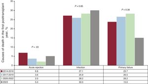To assess changes in the main causes of death over time, we studied the same causes in the first posttransplant year to ensure a comparable follow-up among triennia. Acute rejection significantly decreased as a cause of death during the last decade. In contrast, primary graft failure and infection remained statistically stable in the same period (figure 7).