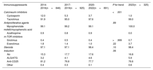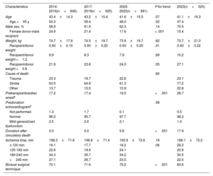 Regarding the remaining characteristics, the last decade showed a highly significant trend toward ensuring recipient-donor sex concordance to avoid the unfavorable matching of a female donor with a male recipient (15.4% of patients in 2023 vs 24.9% in the triennium from 2014 to 2016). Equally, the use of the bicaval technique increased to almost 84% of all procedures. Although the difference was not statistically significant, ischemia time showed a slight tendency toward a decrease, with an average of slightly longer than 3hours in 2023.