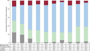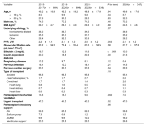 RESULTSRecipient characteristicsIn 2024, 347 transplants were performed, marking a 6.8% increase from 2023 and a 24.8% rise compared with 5 years earlier (2020). In the last 10 years, there has been no significant change in recipient age or sex. However, this has led to a gradual increase in recipients with etiologies other than standard dilated cardiomyopathy, both ischemic and nonischemic, although no such increase was observed in 2024. Statistically significant trends show a progressively more favorable recipient profile, evidenced by a lower proportion of transplants performed in patients who had received prior mechanical ventilation (P=.002), as well as lower pulmonary vascular resistance (P<.003) and fewer recipients with elevated pretransplant serum bilirubin levels (P<.001). In contrast, and as noted in the previous report,1 there was an increase in the percentage of urgent transplants (47.0% in 2024), 6.1% more than in 2023 and 25.0% more than in 2022 (figure 2). This trend parallels the increased use of circulatory assist devices (figure 3), because transplant urgency in Spain is linked to the need for circulatory support, which grew from 37.7% in the 2021 to 2023 triennium to 43.2% in 2024 (table 3). This increase was primarily due to greater use of extracorporeal membrane oxygenation, which rose from 23.2% in 2022 to 36.5% in 2023 and 34.7% in 2024 (figure 3).