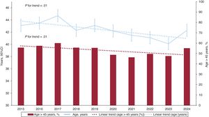Annual changes in donor age (continuous blue line) and percentage of donors older than 45 years (red bars) (2015-2024). The dotted lines indicate the linear adjustment lines of the temporal trend. This figure is shown in color in the online version of this article. 95%CI, 95% confidence interval.