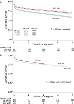 Survival increased once again compared with previous years. In the last decade, 1- and 5-year posttransplant survival rates were 82.4% and 74.3%, respectively. These figures are significantly higher than those for the entire previous period (75.8% and 65.2%) (figure 5A). In the last 10 years, 1-year survival increased from 80.7% in the 2015 to 2017 triennium to 85.2% from 2021 to 2023 (P=.008) (figure 5B).