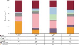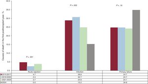 The causes of death (figure 6) in the first 5 posttransplant years remained unchanged and were dominated by primary graft failure and infection in the first posttransplant year. Acute rejection was a less frequent cause of death during this period. In the last decade, mortality in the first year due to acute rejection and infection has shown a significant downward trend, while the proportion of deaths due to primary graft failure has remained stable (figure 7).