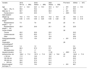 In 2024, there was a slight uptick in the average donor age and in the proportion of suboptimal donors (> 45 years) (table 4). However, this increase did not alter the significant downward trends observed in the last decade for both variables (figure 4). The proportion of male donors rose again (69.3% in 2024), with a highly significant trend in the last decade (P<.001). This has produced a corresponding decrease in the percentage of transplants performed with a donor-recipient sex mismatch (male recipient, female donor). Up to a fifth of donors in 2024 experienced cardiac arrest during the donation process, reflecting an upward trend in the last decade (table 4). In addition, compared with the significant trend toward shorter ischemia times in previous years, a slight increase was detected in 2024 vs the most recent 3-year period.