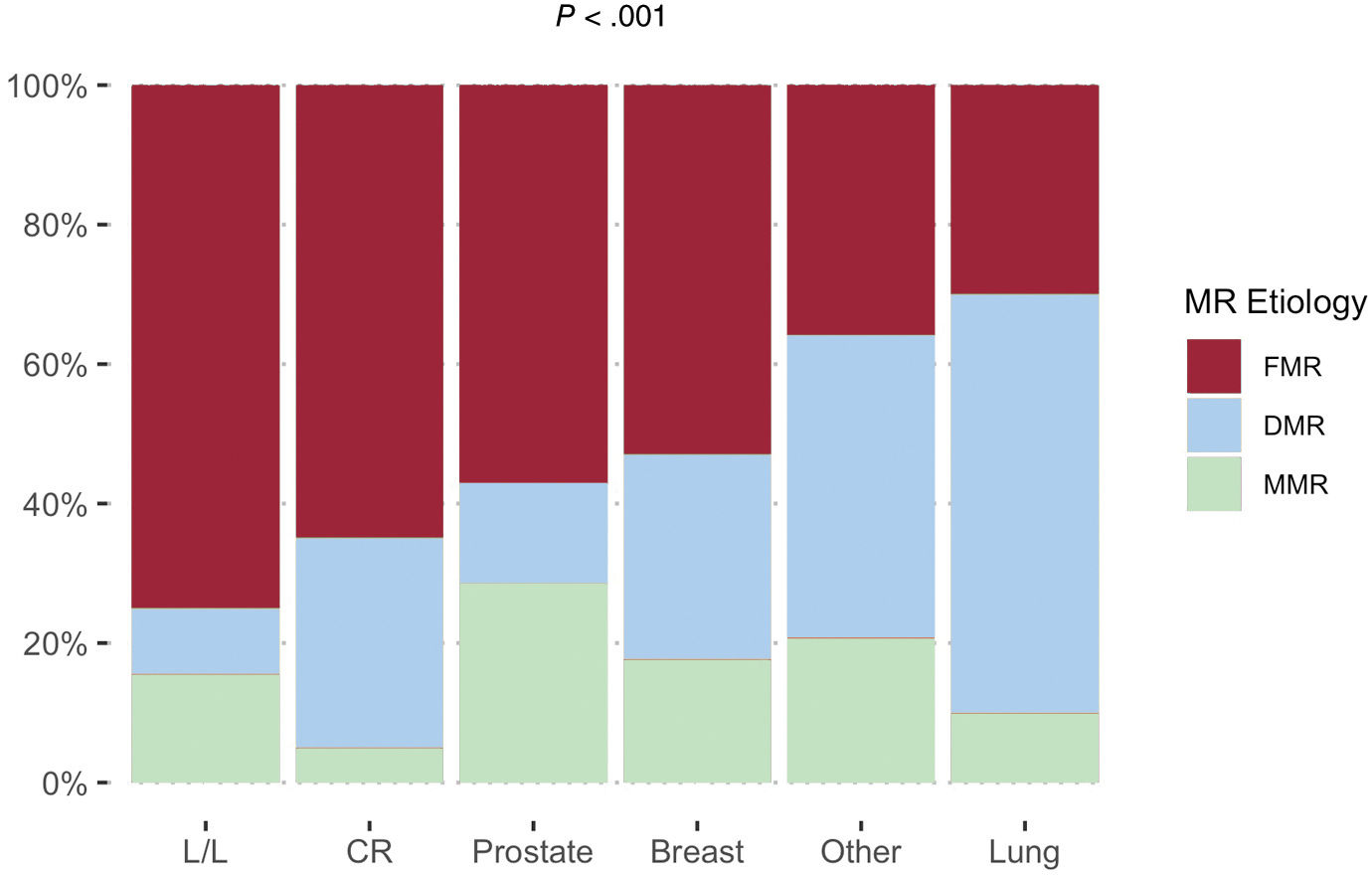 Mitral regurgitation etiology according to cancer location. Cancer location was associated with MR etiology. FMR was particularly frequent in L/L patients, whereas DMR was the most frequent etiology in lung cancer survivors. CR, colorectal; DMR, degenerative mitral regurgitation; FMR, functional mitral regurgitation; L/L, leukemia or lymphoma; MMR, mixed mitral regurgitation; MR, mitral regurgitation.
