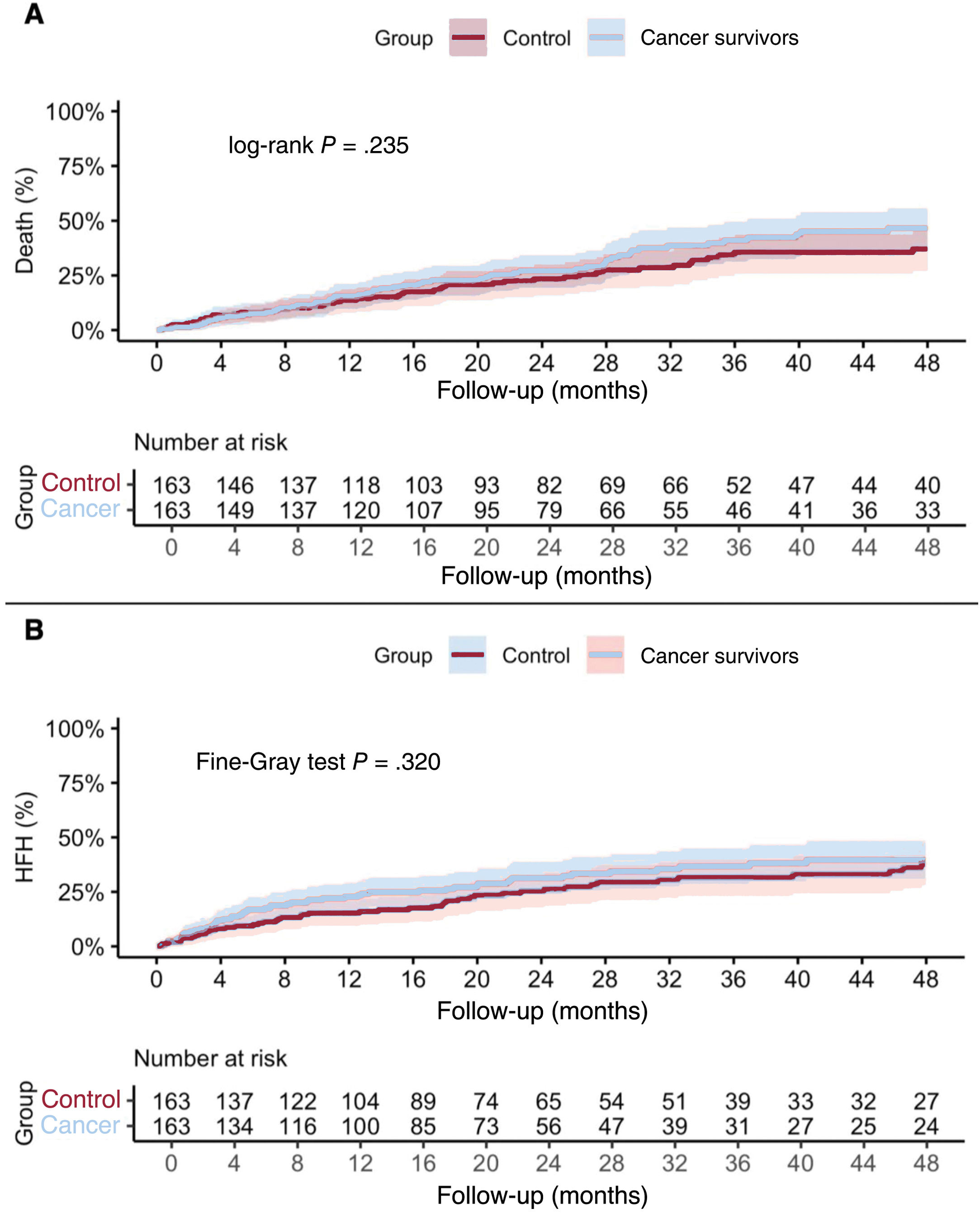 No significant differences were observed between cancer survivors and controls regarding the individual components of the primary endpoint. A total of 101 (31.0%) all-cause deaths occurred, 56 (34.4%) in the cancer survivor group and 45 (27.6%) in the control group (HR, 1.27; 95%CI, 0.86-1.88; P = .237) (figure 3A). In addition, 100 (30.1%) patients experienced at least 1 episode of heart failure hospitalization, including 54 (33.1%) in the cancer survivor group and 46 (28.2%) in the control group. The subdistribution hazard ratio (sHR) for heart failure hospitalization, accounting for death as a competing risk, was 1.22 (95%CI, 0.82-1.80; P=.320) (figure 3B).