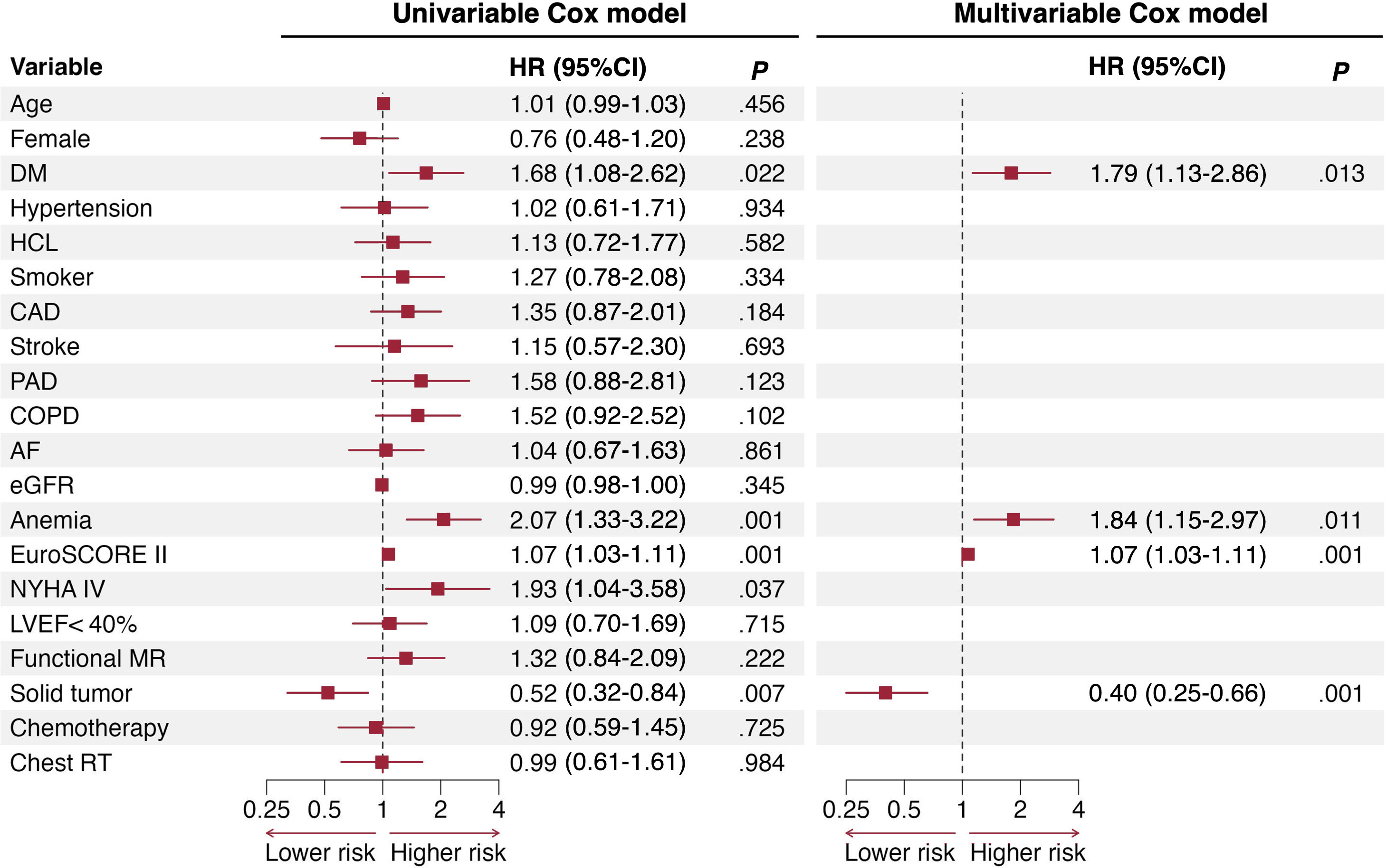 Forest plot of predictors of all-cause mortality or heart failure hospitalization in the cancer cohort. Univariable Cox regression (left) and multivariable Cox regression (right). The initial multivariable model included those variables with P <.15 in the univariable models. 95%CI, 95% confidence interval; AF, atrial fibrillation; CAD, coronary artery disease; DM, diabetes mellitus; eGFR, estimated glomerular filtration rate; HCL, hypercholesterolemia; HR, hazard ratio; LVEF, left ventricular ejection fraction; MR, mitral regurgitation; NYHA, New York Heart Association; PAD, peripheral artery disease; RT, radiotherapy.