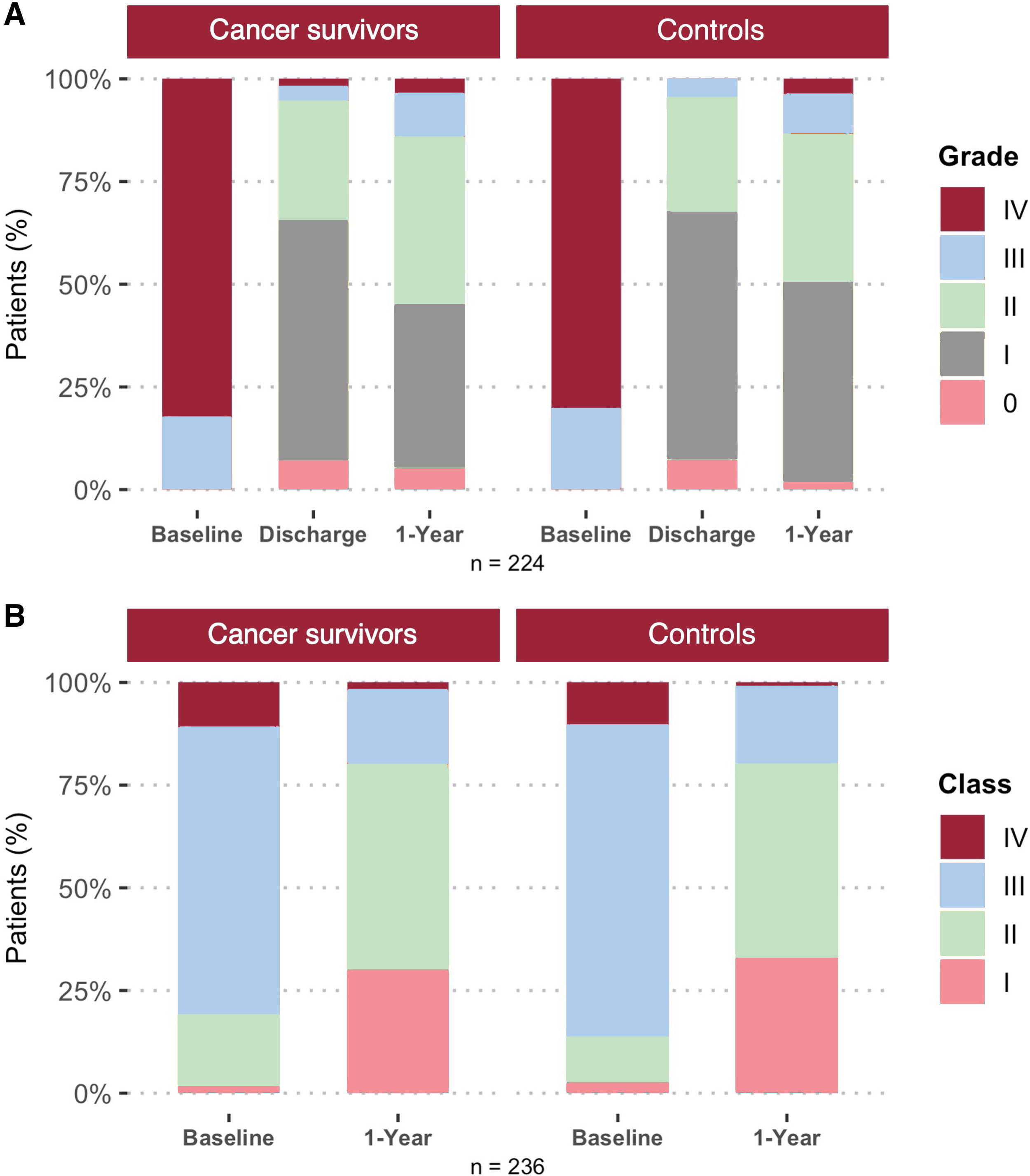 Among the 238 patients who were alive and had clinical follow-up at 1 year, echocardiographic and functional status data were available for 224 (94%) and 236 (99%) patients, respectively. At 1 year, 85.8% of patients in the cancer survivor group had MR grade II or lower, compared with 86.5% of patients in the control group (P = .889) (figure 5A). Regarding functional status, 80.0% of patients in the cancer survivor group and 80.2% in the control group were classified as New York Heart Association functional class I or II (P = .974) (figure 5B). The improvement in MR grade and New York Heart Association functional class compared with baseline was statistically significant for both the cancer and control groups (P < .001).