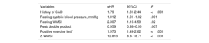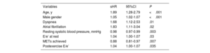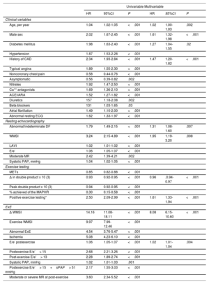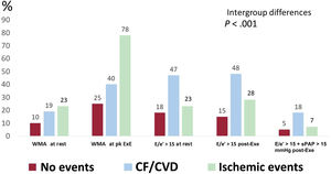 ResultsSystolic abnormalities were found in 806 patients (32%) and diastolic abnormalities in 451 (18%). Patients with CF/CVD more frequently had abnormal postexercise DF than those with ischemic events (48% vs 27%; P <.001), whereas the percentage of systolic abnormalities was higher in the latter group (78% vs 40%; P <.001). During follow-up, there were 477 events. Independent overall predictors included Δ wall motion score index (Δ WMSI) (HR, 8.08; 95%CI, 6.15-10.60; P <.001), and postexercise E/e’ (HR, 1.02; 95%CI, 1.01-1.04; P=.004). Predictors of CF/CVD also included postexercise DF (E/e’: sHR, 1.04; 95%CI, 1.00-1.07; P=.035) but not systolic function. Conversely, predictors of ischemic events included systolic function (Δ WMSI: sHR=12.81; 95%CI, 8.8- 18.71; P <.001) but not DF.