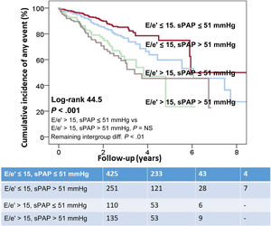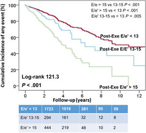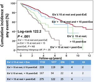 MethodsSystolic and DF were evaluated during exercise echocardiography in 2519 patients: left ventricular systolic function at peak-exercise (step 1), and E/e’/systolic pulmonary pressure postexercise (step 2). Abnormal systolic function was defined as ischemia or fixed wall motion abnormalities; abnormal DF was defined as postexercise E/e’> 15. The endpoint was to analyze the predictive value of systolic and DF for cardiac failure/cardiovascular death (CF/CVD), and for ischemic events.