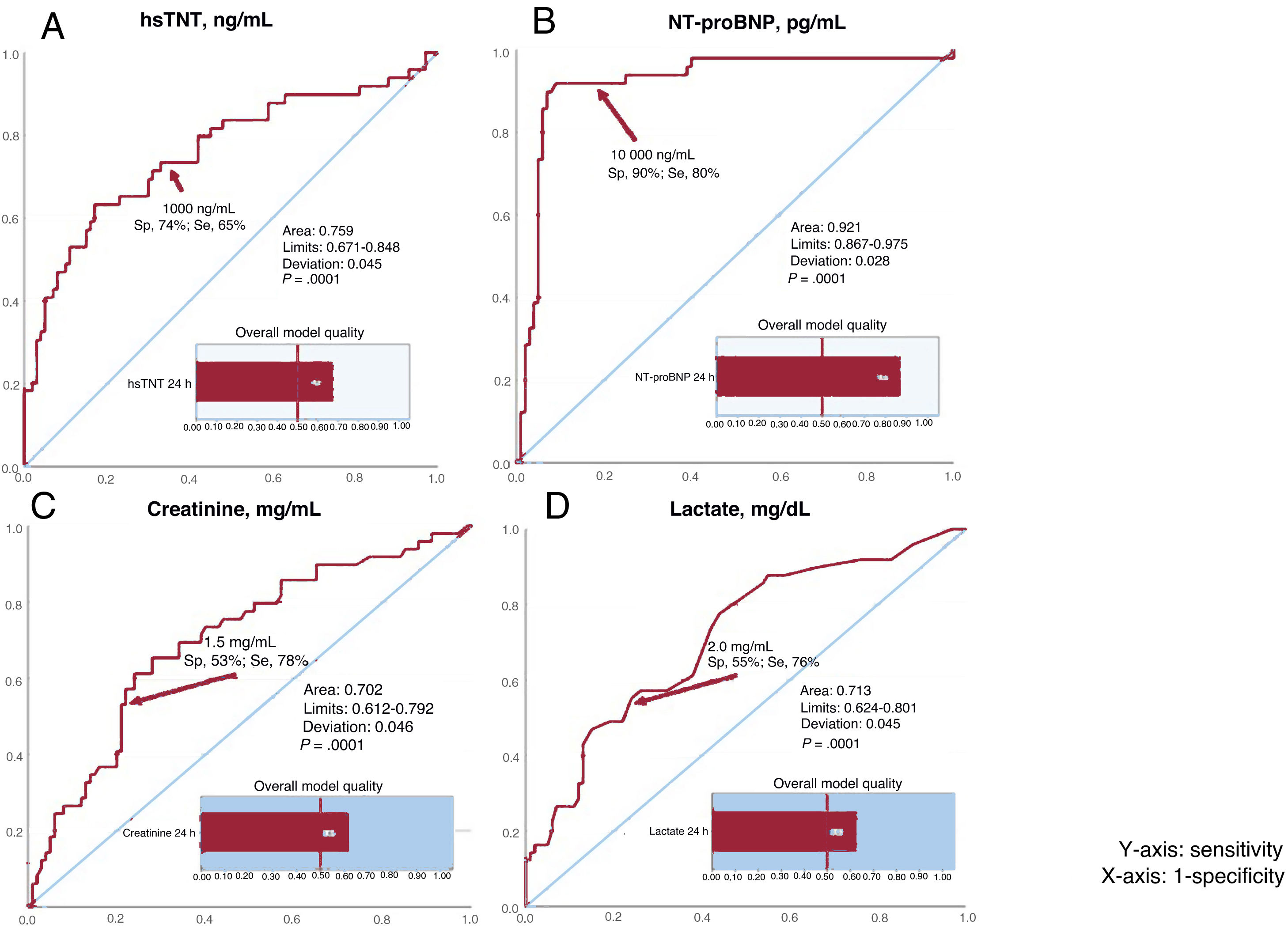 Receiver operating characteristic curves for severe primary graft failure or in-hospital mortality for blood levels measured 24hours after heart transplantation: troponin (A), NT-proBNP (B), creatinine (C), and lactate (D). hsTNT, high-sensitivity troponin T; NT-proBNP, N-terminal pro-B-type natriuretic peptide; Se, sensitivity; Sp, specificity.