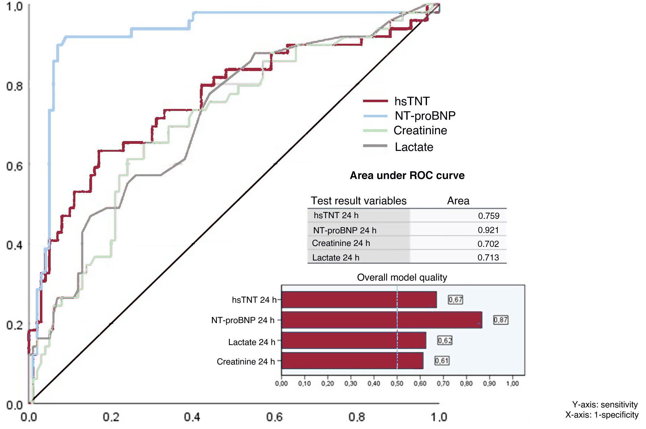 The ROC curve analysis for biomarker levels at 24hours showed significant areas under the curve (P = .0001), with values ranging from 0.702 for creatinine to 0.921 for NT-proBNP. The overall model quality exceeded 50% in all cases. ROC curves depicting sensitivity and specificity cutoff points for some of the reference values are shown in figure 3. The cutoff of 10 000 pg/mL observed for NT-proBNP is particularly relevant from a clinical perspective, as it predicted the primary composite outcome with a sensitivity of 90% and a specificity of 80%. The ROC curves for all the biomarkers were significant and showed similar patterns, except for the NT-proBNP curve, which more effectively identified patients at risk of death or severe PGF in the first 24hours post-HT. The curves are compared in figures 4 and 5.