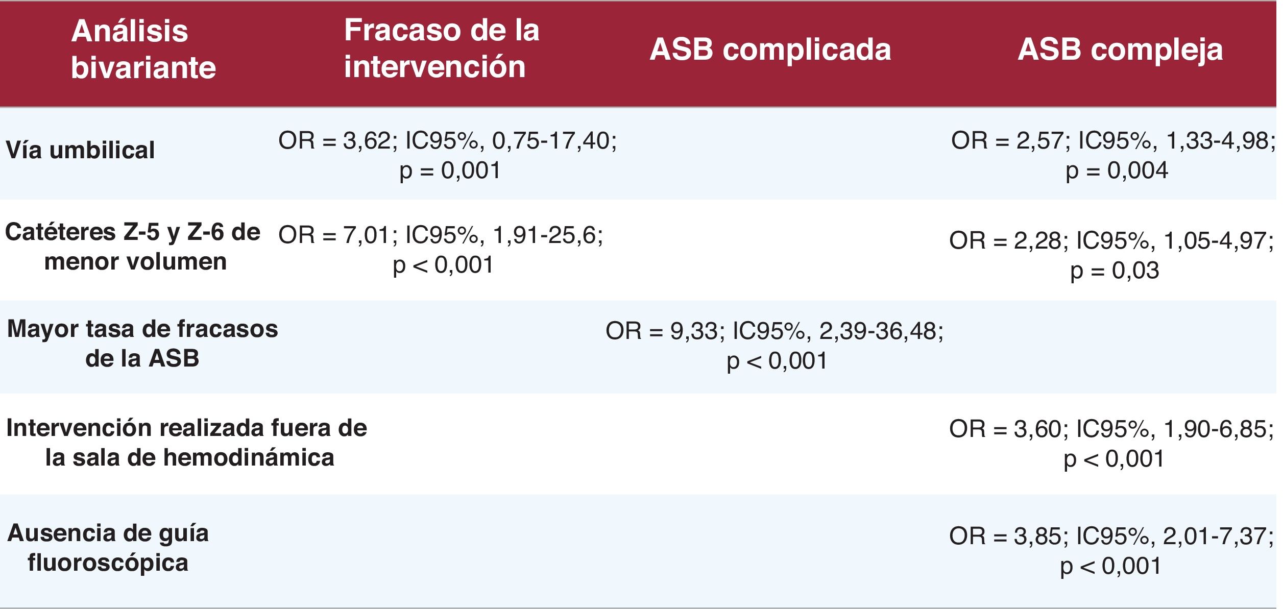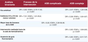 Los análisis bivariantes (figura 5) mostraron que el fracaso de la intervención se asociaba con el uso de la vía venosa umbilical (odds ratio [OR]=3,62; intervalo de confianza del 95% [IC95%], 1,75-17,40; p=0,001) y catéteres Z-5 y Z-6 de menor volumen (1 frente a 2ml) (OR=7,01; IC95%, 1,91-25,62; p<0,0001), sin diferencias estadísticas entre las familias de catéteres Z-5 y Z-6. Además, las intervenciones complicadas solo se asociaron estadísticamente con una mayor tasa de fracaso de la ASB (OR=9,33; IC95%, 2,39-36,48; p<0,001).