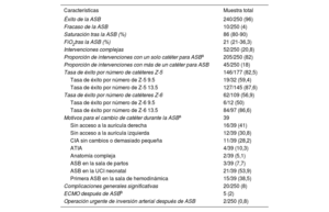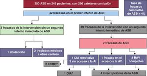 Los datos de las intervenciones se resumen en la tabla 2. La ASB se realizó durante el día en el 72,8% de los casos y en la sala de hemodinámica en el 59,2% de los casos. Se utilizó anestesia general en el 64,8%. La guía ecográfica sola se empleó en el 42% de las intervenciones, mientras que en la mayoría se usó guía ecográfica combinada con fluoroscopia. En el 41,2% de los casos, se utilizó una aguja guía por diversos motivos. En total, se emplearon 290 catéteres con balón para ASB (286 catéteres Z-5 o Z-6) en 250 intervenciones. Los motivos del cambio de catéteres se resumen en la tabla 3.