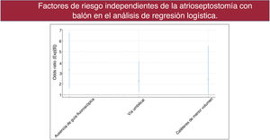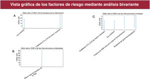 Las intervenciones complejas se asociaron con el uso de catéteres Z-5 o Z-6 de menor volumen (OR=2,28; IC95%, 1,05-4,97; p=0,03), la vía venosa umbilical (OR=2,57; IC95%, 1,33-4,98; p=0,004), intervenciones de ASB realizadas fuera de la sala de hemodinámica (OR=3,60; IC95%, 1,90-6,85; p<0,001) y la ausencia de guía fluoroscópica (OR=3,85; IC95%, 2,01-7,37; p<0,001). Ningún otro parámetro estudiado se asoció con los resultados de la intervención. En la figura 6, se ofrece una representación gráfica de las OR y los IC95% del análisis bivariante.