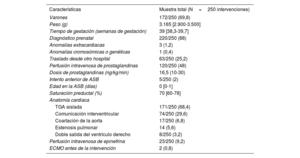 En general, se analizaron 252 intervenciones de 247 pacientes y se excluyó a 2 pacientes por datos incompletos. Las características iniciales de los pacientes se resumen en la tabla 1. Entre los 245 pacientes restantes (250 intervenciones de ASB), el 88% tenían un diagnóstico prenatal y la mediana de saturación de oxígeno preductal era del 70%. Además, 2 pacientes precisaron soporte de ECMO antes de que se les realizara la ASB.