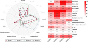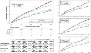 ResultadosSe identificaron 4 clústeres distintos. La mortalidad al año fue del 18,7%. El clúster 4 (fenotipo mujer joven con valvulopatía) tuvo la mortalidad más baja (13,7%; referencia), y esta aumentaba progresivamente en el clúster 2 (fenotipo cardiometabólico; mortalidad: 15,7%; HR ajustada=1,28; IC95%, 1,06-1,54), clúster 3 (fenotipo mujer muy anciana; mortalidad: 20,4%; HR=1,63; IC95%, 1,40-1,90) y clúster 1 (fenotipo varón con cardioneumopatía; mortalidad: 24,0%; HR=1,81; IC95%, 1,53-2,13). Los resultados fueron muy similares en cada registro analizado individualmente. Los inhibidores del sistema renina-angiotensina se asociaron a mejor supervivencia en todos los clústeres, los bloqueadores beta en el 1 y los anticoagulantes en el 4, si bien no hubo ningún tratamiento con una asociación distinta con el pronóstico en función del fenotipo.